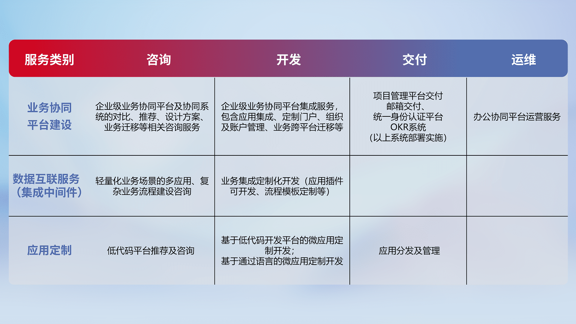 针对钉钉、、、、企微、、、、IDaas等平台级产品提供产品的规划、、方案、、、交付、、、、定制化开发等服务,,实现如统一协同办公、、、、智能客户服务、、、、混合会议管理、、、智能数据查询、、等业务场景,,实现数字化转型。。