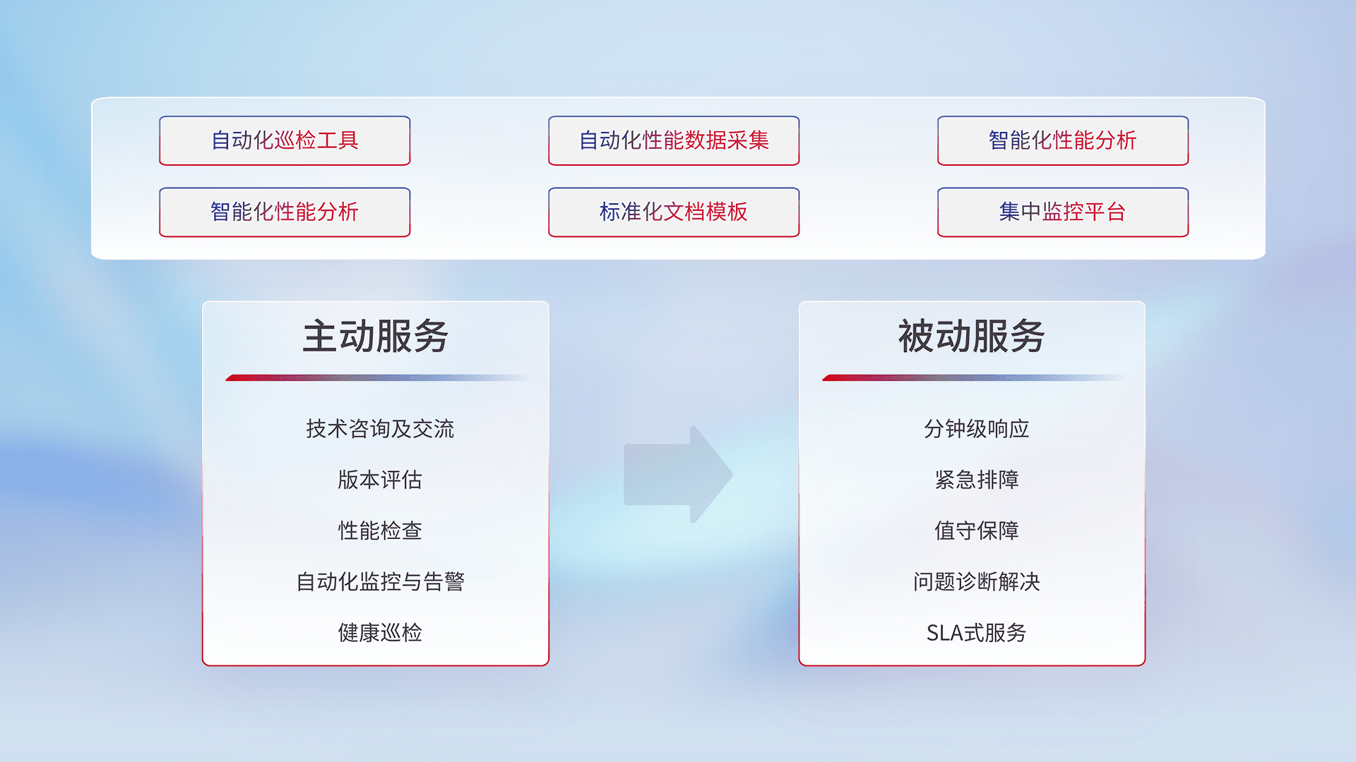 智能化工具和标准化文档,,保障服务质量,,,提供主动服务(包含技术咨询、、、版本评估、、性能检查、、自动化监控与告警、、健康巡检)和被动服务包含(分钟级响应、、、、紧急排障、、、值守保障、、、问题诊断解决、、、SLA服务)。。。。